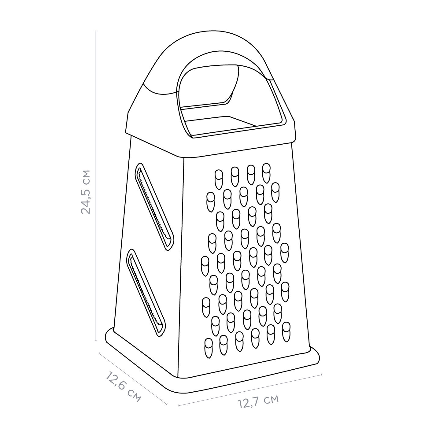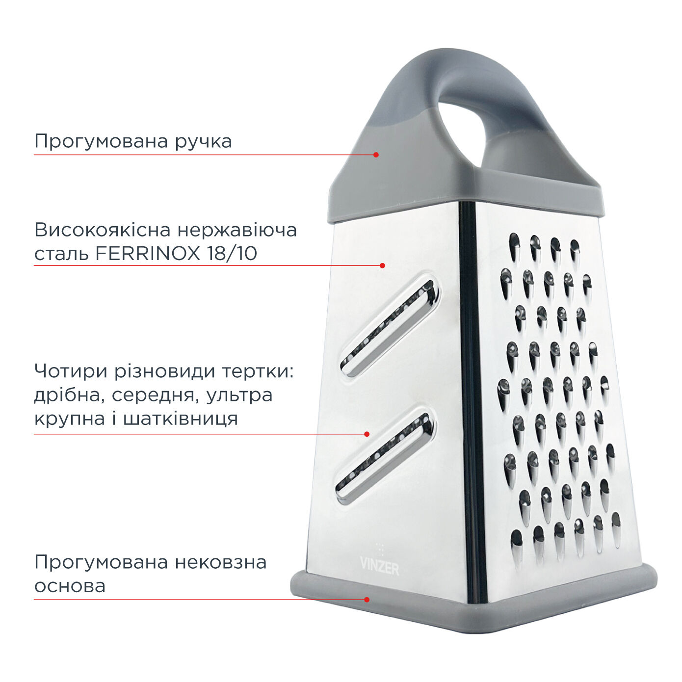 Матеріал стійкий до корозії та деформації, впливу агресивних речовин. Ручка та основа терки прогумовані, тому вона зручна та безпечна у використанні.