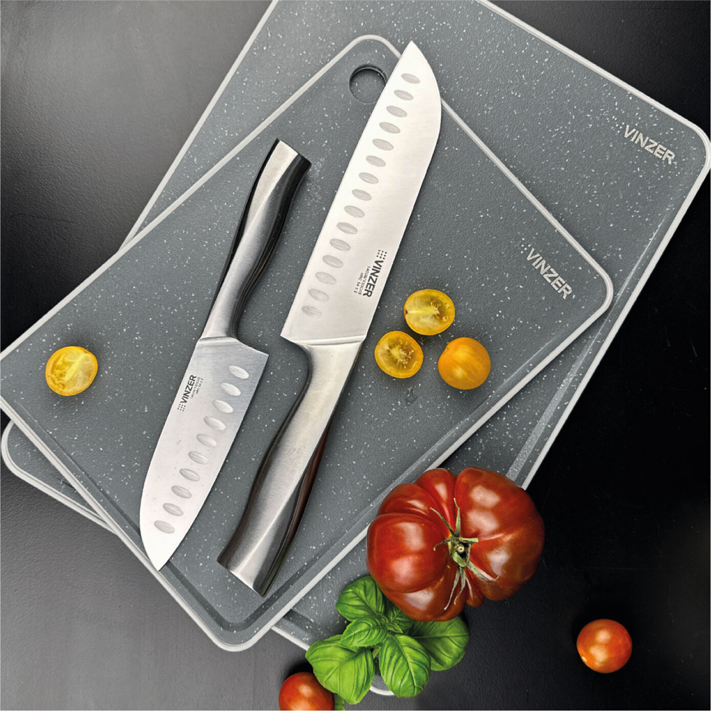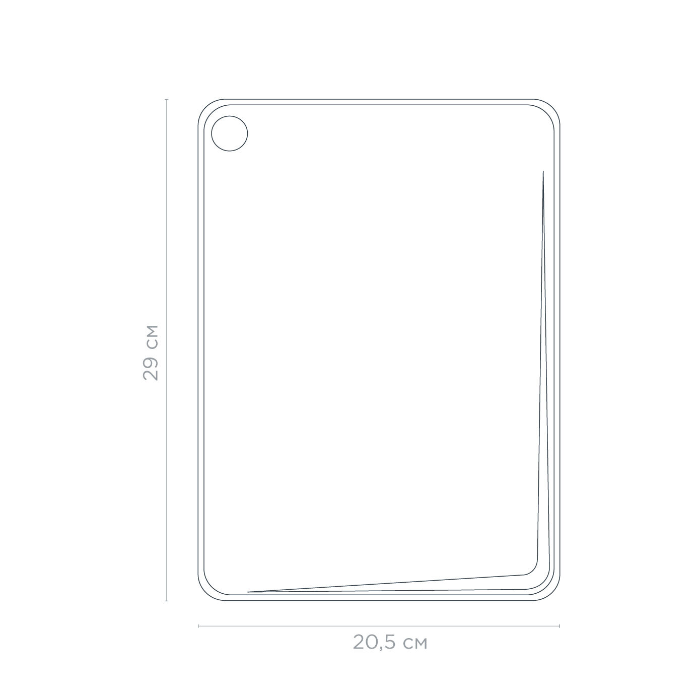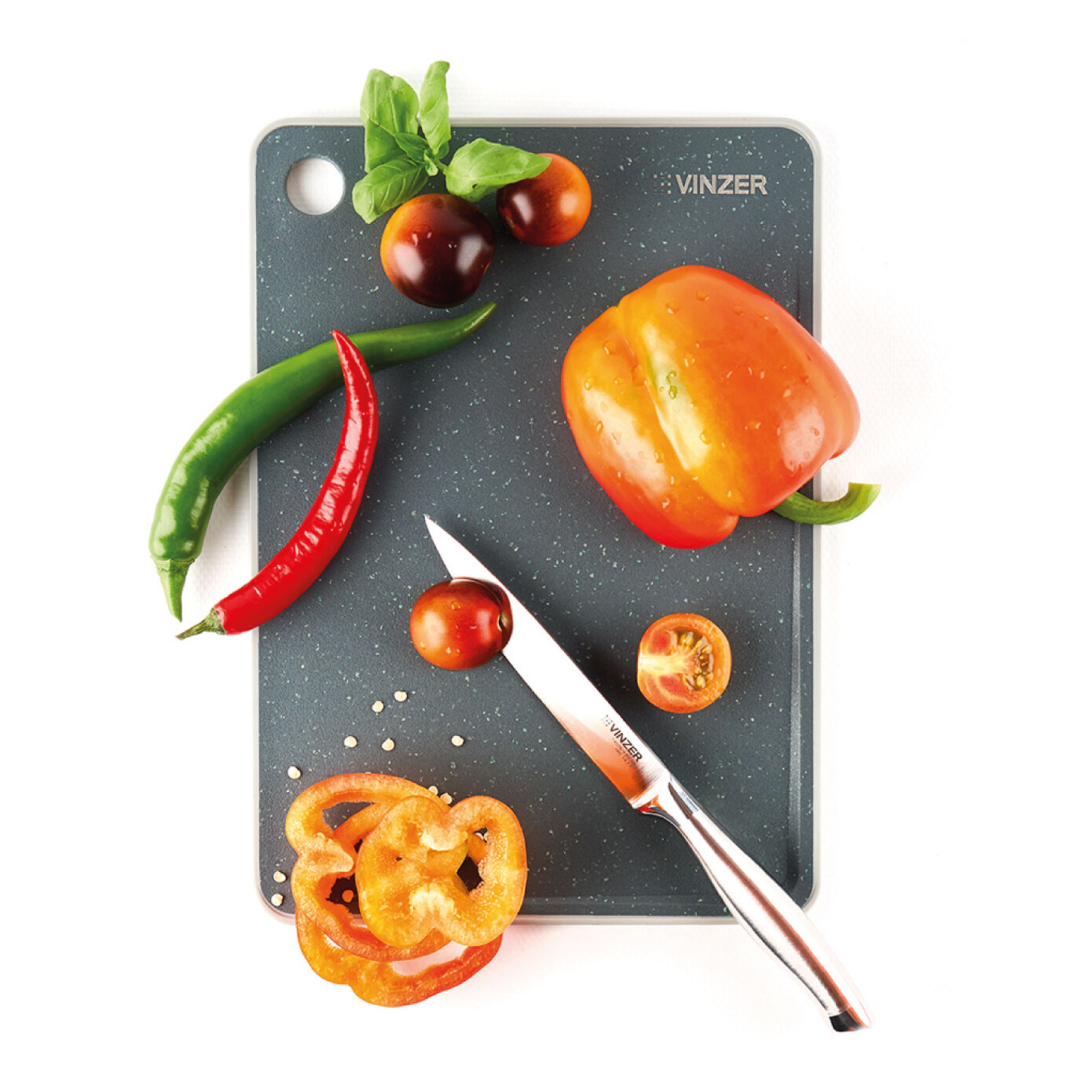 Дошка виготовлена із харчового пластику високої якості без вмісту небезпечних компонентів. Матеріал легко миється, не вбирає вологу та запахи. Нековзна поверхня забезпечує зручне та безпечне використання, а також зберігає лезо ножа гострим. Поверхня дошки розташована під кутом та має борти, завдяки чому рідина не стікає на стіл. Дошку можна мити в посудомийній машині.