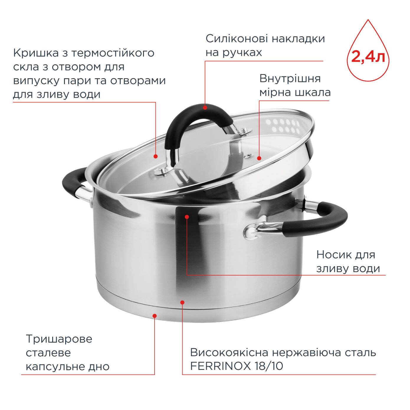 Обирала каструлю саме зі зливним носиком, бо це дуже зручно. Сам матеріал каструлі хорошої якості, а от носик не виконує свою функцію.