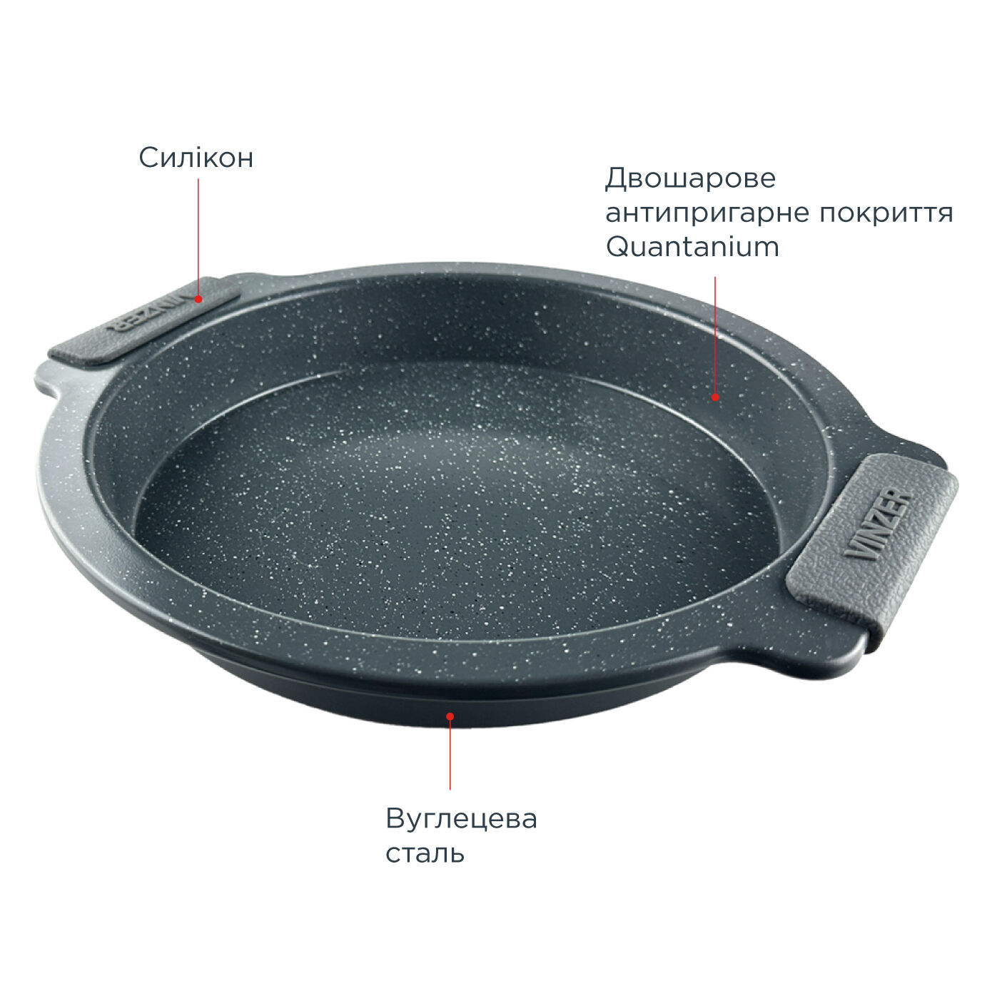 Круглая форма для запекания идеально подходит для приготовления бисквитов, пирогов, запеканок. Форма изготовлена из высокопрочной углеродистой стали, устойчивой к механическим повреждениям, высоким температурам и коррозии. Покрытие формы антипригарное, состоящее из двух слоев. Удобные ручки укомплектованы силиконовыми накладками, которые не позволяют форме выскользнуть из рук.