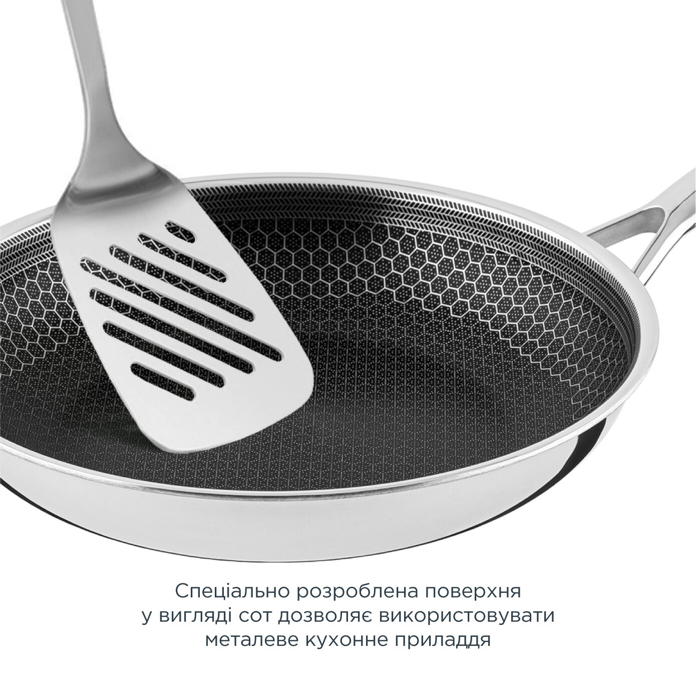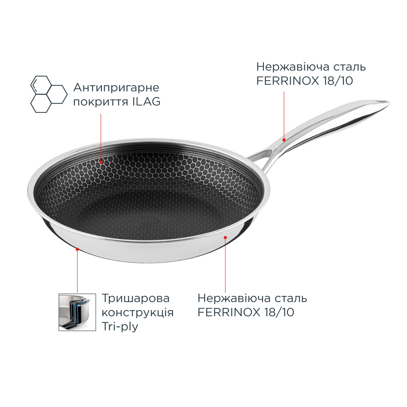 Инновационная компактная сковорода Vinzer 3D Cube Induction Line диаметром 20 см подходит для всех видов кухонных плит, включая индукционные. Ее отличительная особенность - трехслойная конструкция Tri-ply: внешний слой - высококачественная нержавеющая сталь FERRINOX 18/10, средний слой - чистый алюминий, внутрений слой - высококачественная нержавеющая сталь FERRINOX 18/10. Благодаря многослойности используемых материалов обеспечивается быстрое и равномерное распределение тепла по дну сковороды. Сковорода оснащена эргономичной ненагревающейся литой стальной ручкой. Уникальное антипригарное покрытие ILAG скрыто под специальными сотами, благодаря чему поверхность для жарки обладает повышенной прочностью и устойчивостью к царапинам. При приготовлении блюд вы смело можете использовать металлические лопатки, не боясь повредить антипригарный слой. За сковородой Vinzer 3D Cube Induction Line очень легко ухаживать - ее можно мыть как вручную, так и в посудомоечной машине.