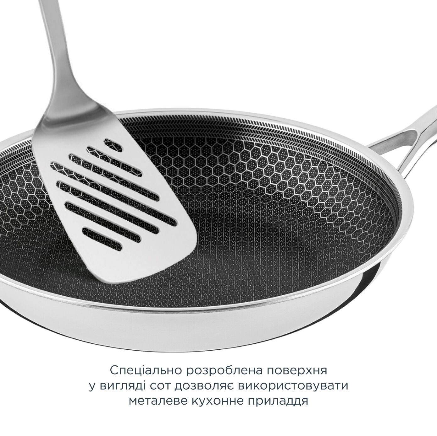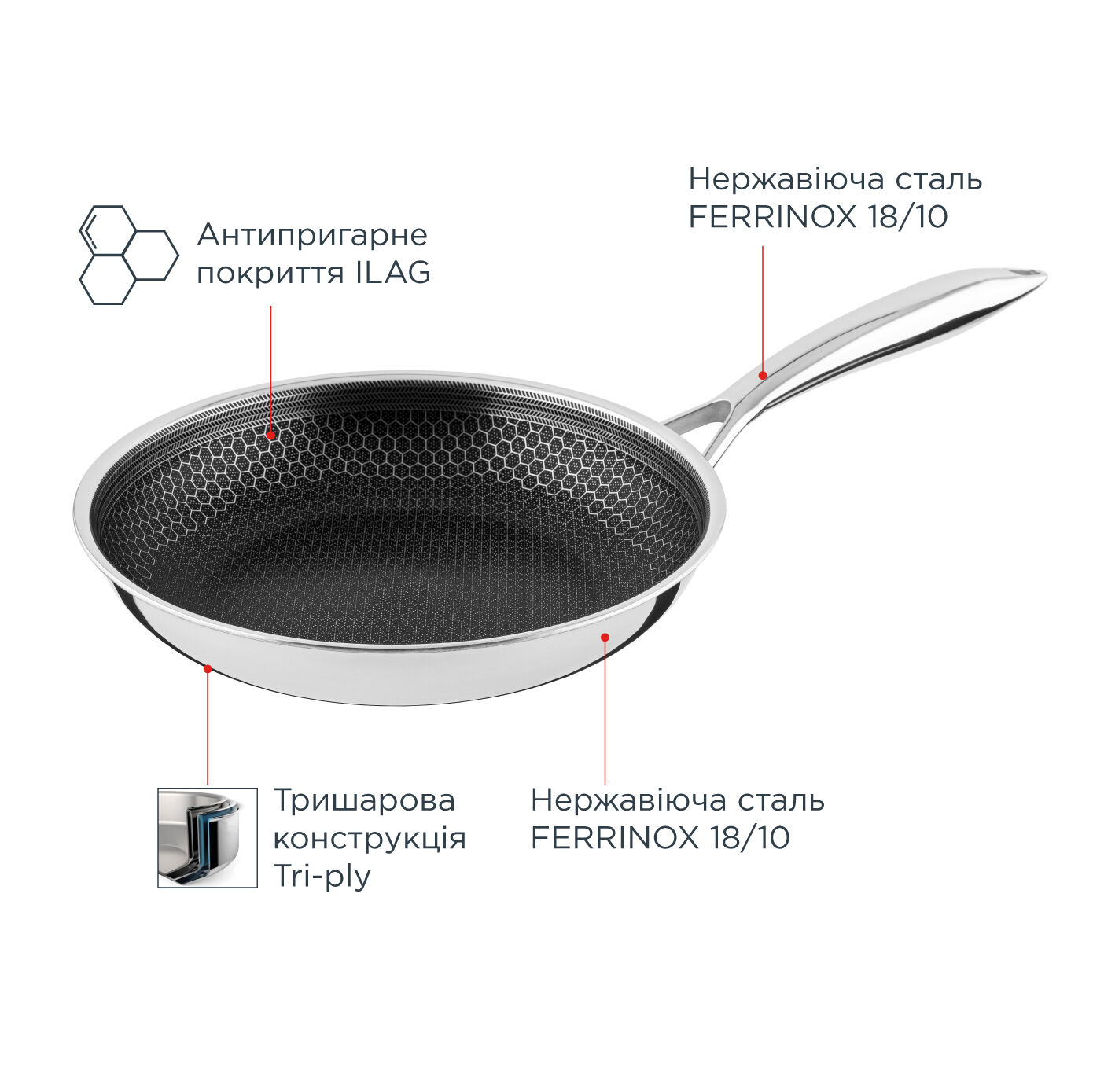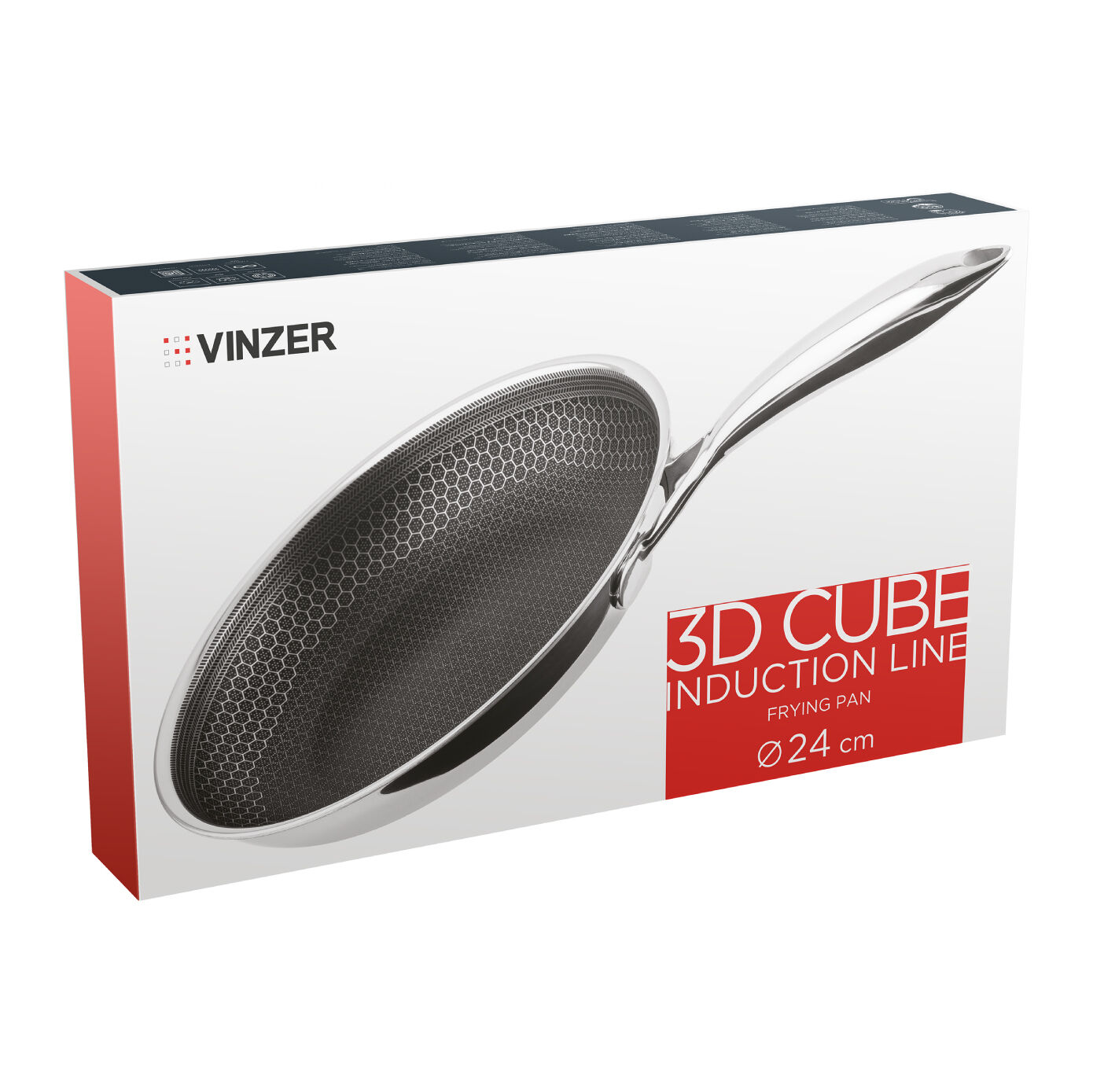 Инновационная сковорода Vinzer 3D Cube Induction Line диаметром 24 см подходит для всех видов кухонных плит, включая индукционные. Ее отличительная особенность - трехслойная конструкция Tri-ply: внешний слой - высококачественная нержавеющая сталь FERRINOX 18/10, средний слой - чистый алюминий, внутрений слой - высококачественная нержавеющая сталь FERRINOX 18/10. Благодаря многослойности используемых материалов обеспечивается быстрое и равномерное распределение тепла по дну сковороды. Сковорода оснащена эргономичной ненагревающейся литой стальной ручкой. Уникальное антипригарное покрытие ILAG скрыто под специальными сотами, благодаря чему поверхность для жарки обладает повышенной прочностью и устойчивостью к царапинам. При приготовлении блюд вы смело можете использовать металлические лопатки, не боясь повредить антипригарный слой. За сковородой Vinzer 3D Cube Induction Line очень легко ухаживать - ее можно мыть как вручную, так и в посудомоечной машине.