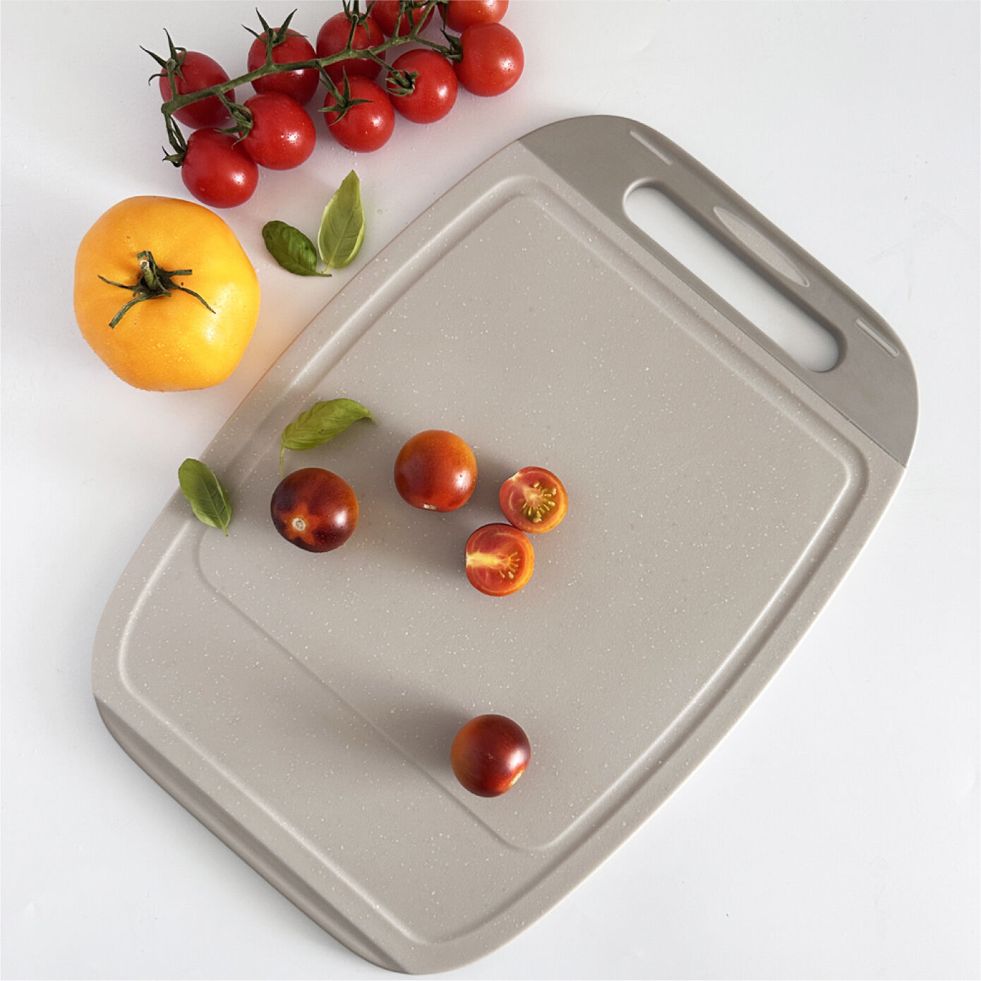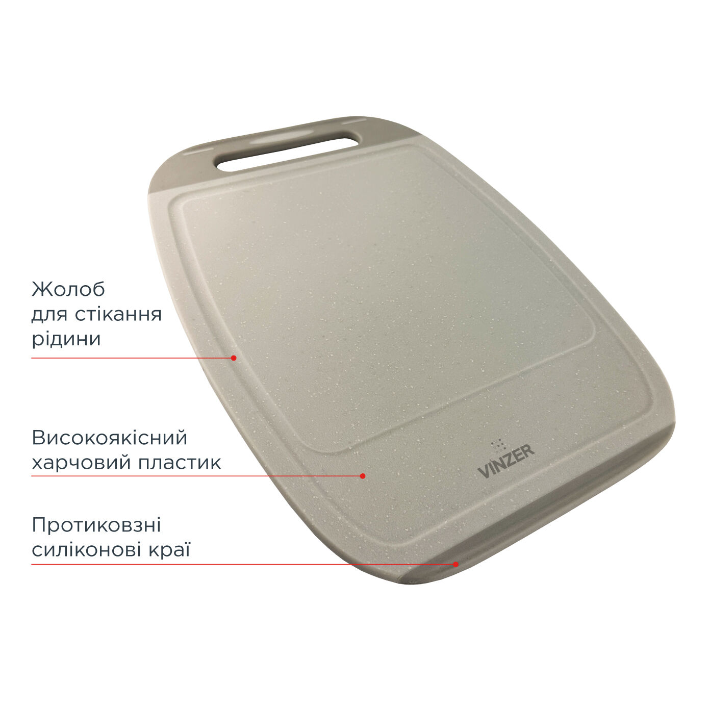 Разделочная доска — незаменимый предмет на каждой кухне, который используется ежедневно для нарезки, шинкования и измельчения продуктов. Доска изготовлена из пищевого пластика высокого качества без содержания опасных компонентов. Материал легко моется, не впитывает влагу и запахи. Нескользящая поверхность обеспечивает удобное и безопасное использование, а также сохраняет лезвие ножа острым. Доска оснащена прорезиненной вставкой по краям для надёжной фиксации на столе и имеет канавку для стекания жидкости.