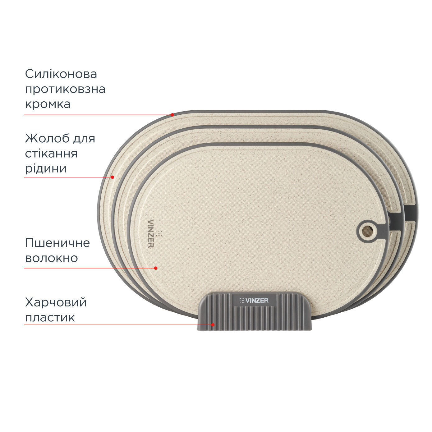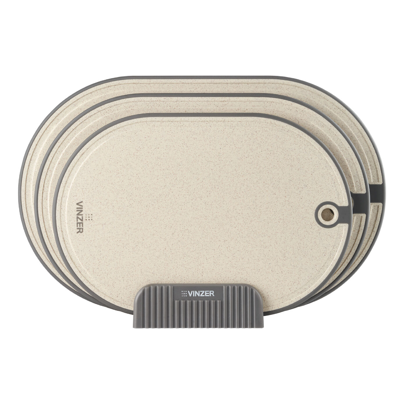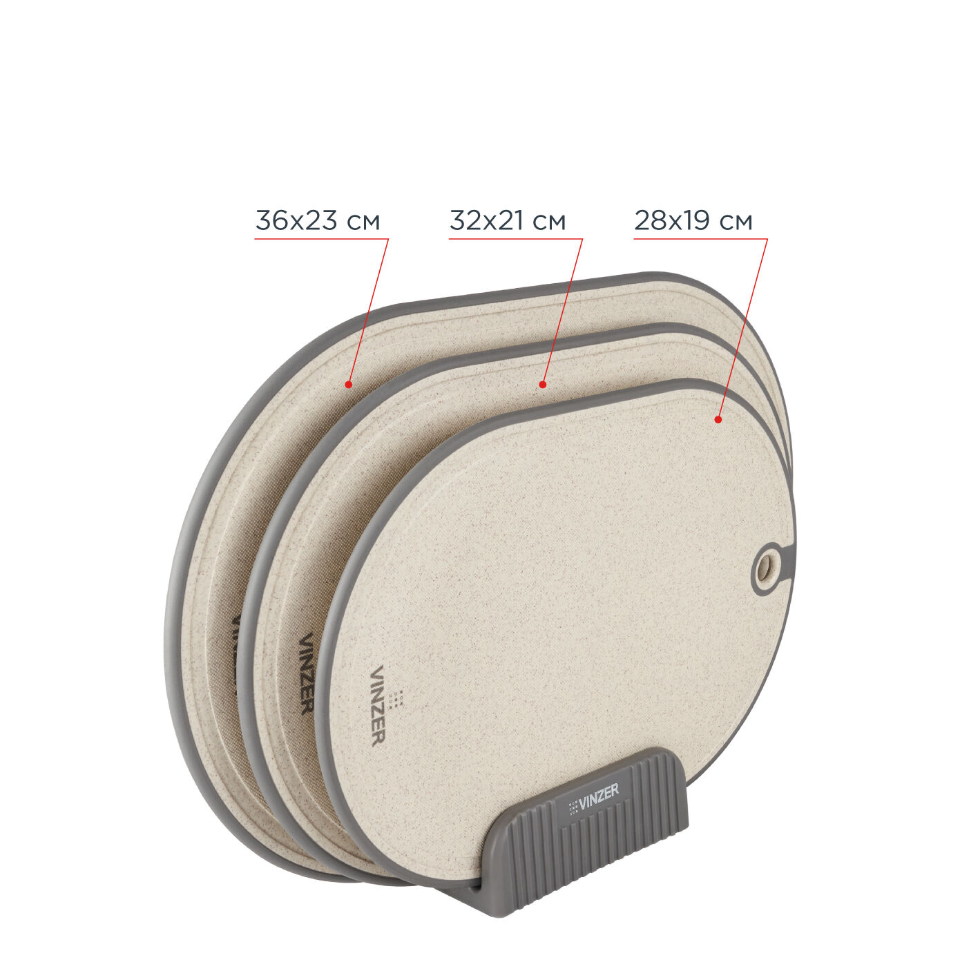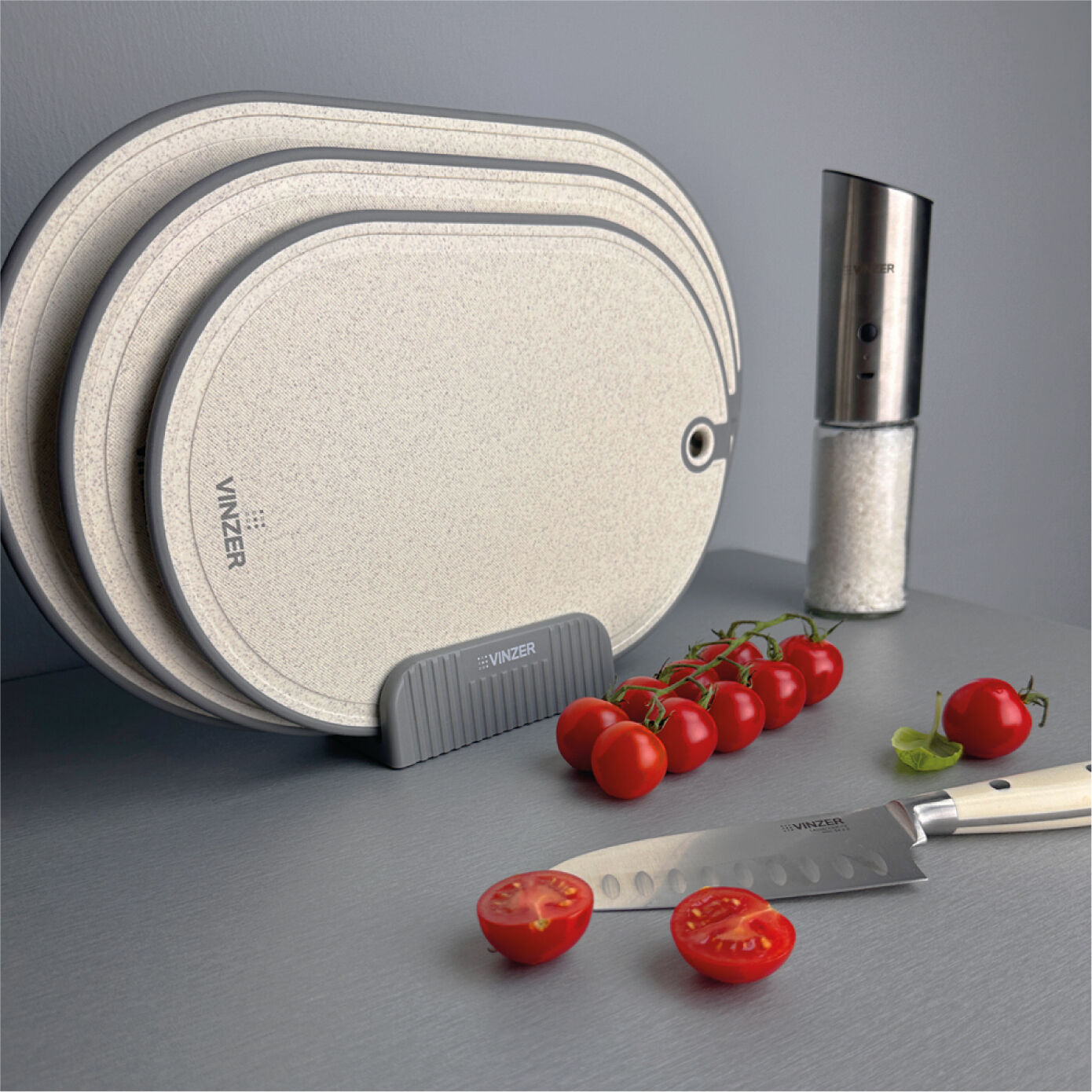 Практичный и стильный набор разделочных досок станет незаменимым помощником на вашей кухне. В комплект входят три доски разного размера, выполненные в элегантном дизайне и компактная подставка для хранения. Доски изготовлены из пшеничного волокна и высококачественного пищевого пластика, поэтому не впитывают влагу и запахи. Благодаря удобной подставке, доски компактно хранятся и всегда под рукой. Каждая доска оснащена прорезиненной вставкой по краям для надёжной фиксации на столе и имеет канавку для стекания жидкости.