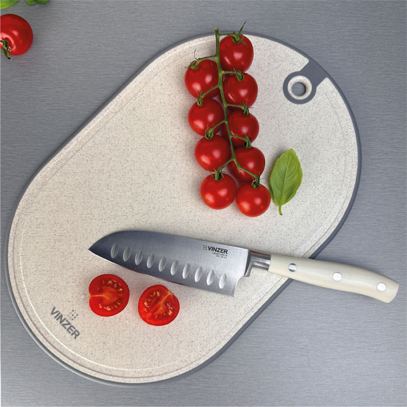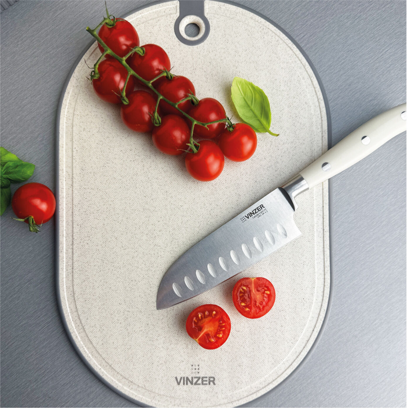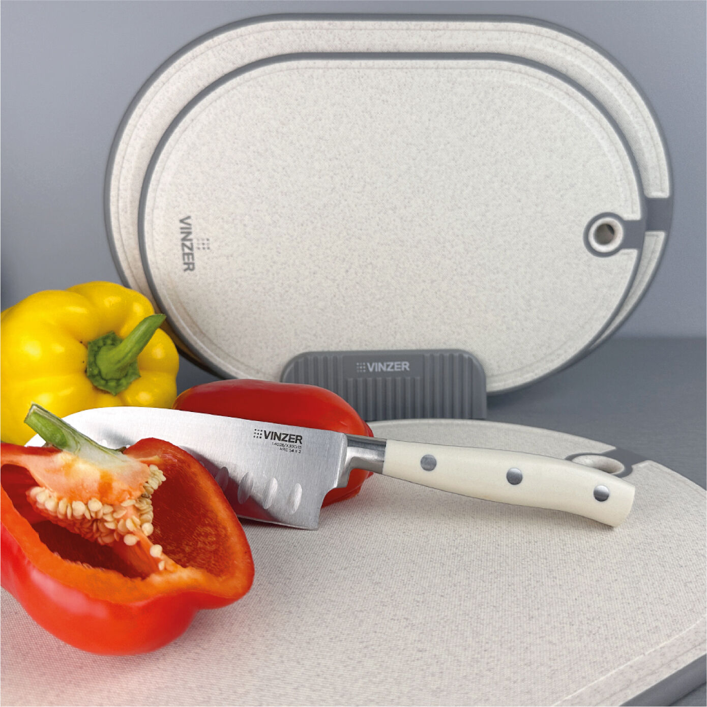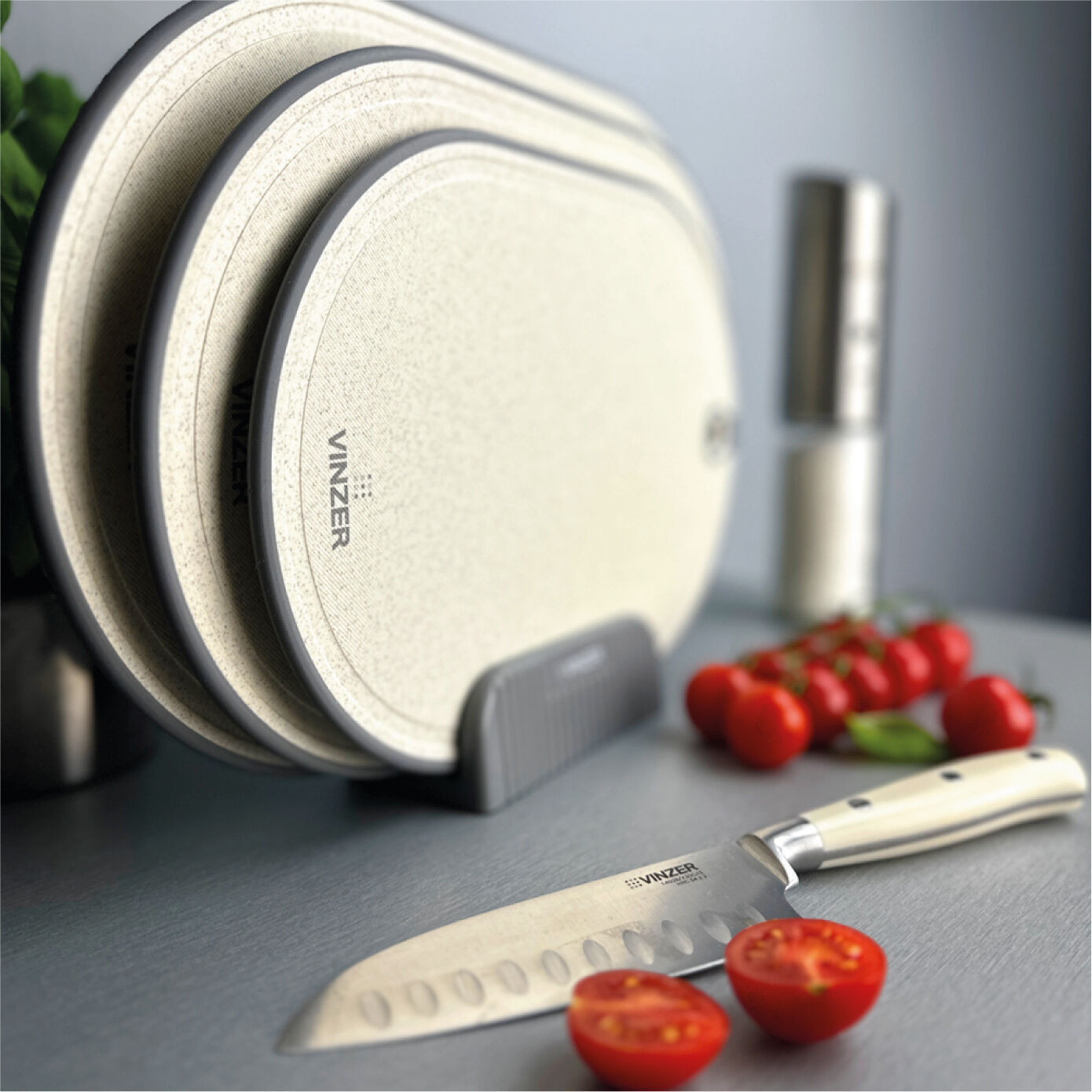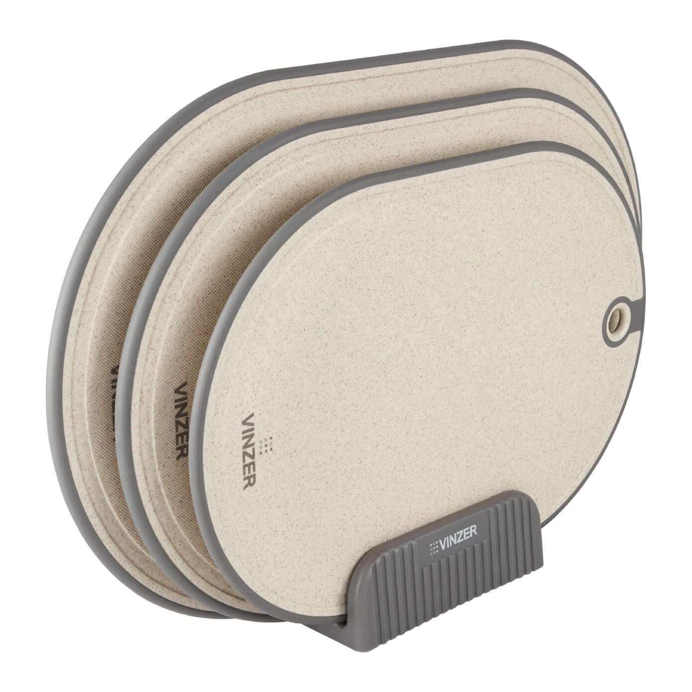 Практичный и стильный набор разделочных досок станет незаменимым помощником на вашей кухне. В комплект входят три доски разного размера, выполненные в элегантном дизайне и компактная подставка для хранения. Доски изготовлены из пшеничного волокна и высококачественного пищевого пластика, поэтому не впитывают влагу и запахи. Благодаря удобной подставке, доски компактно хранятся и всегда под рукой. Каждая доска оснащена прорезиненной вставкой по краям для надёжной фиксации на столе и имеет канавку для стекания жидкости.