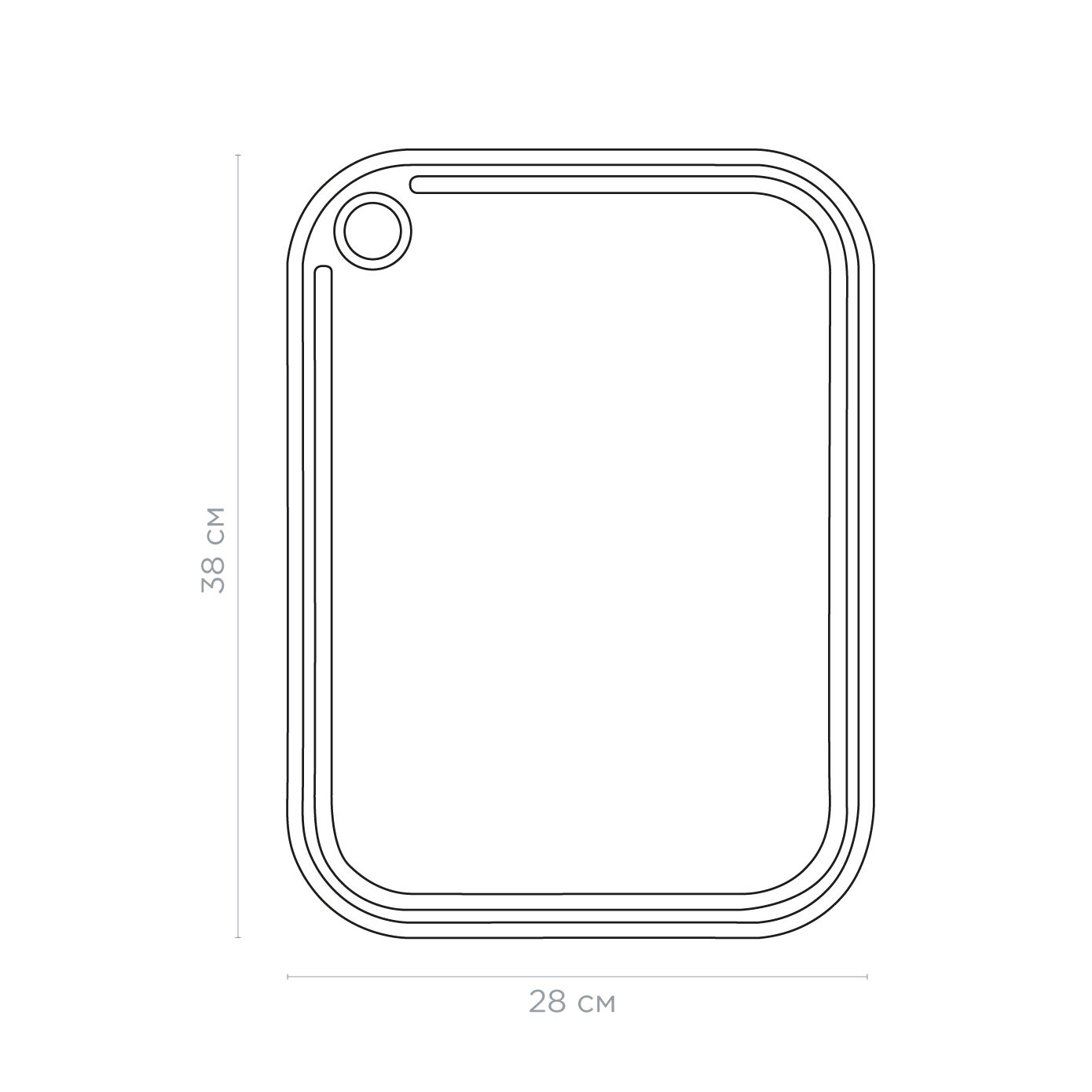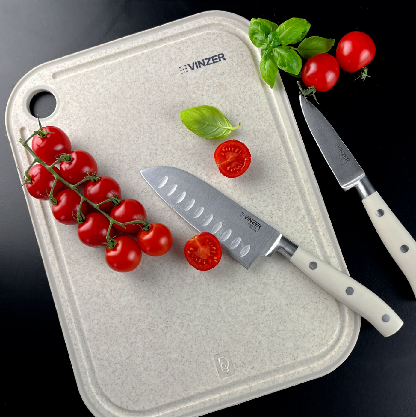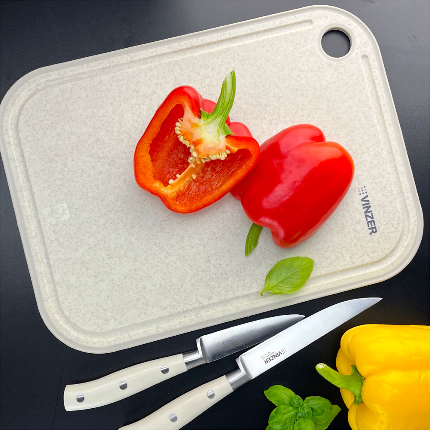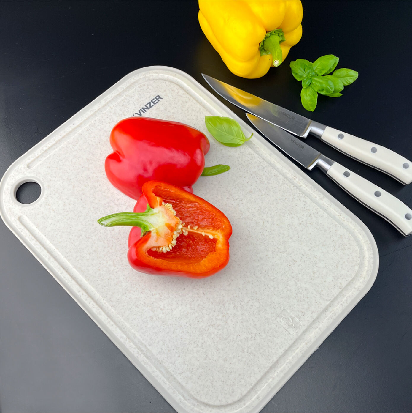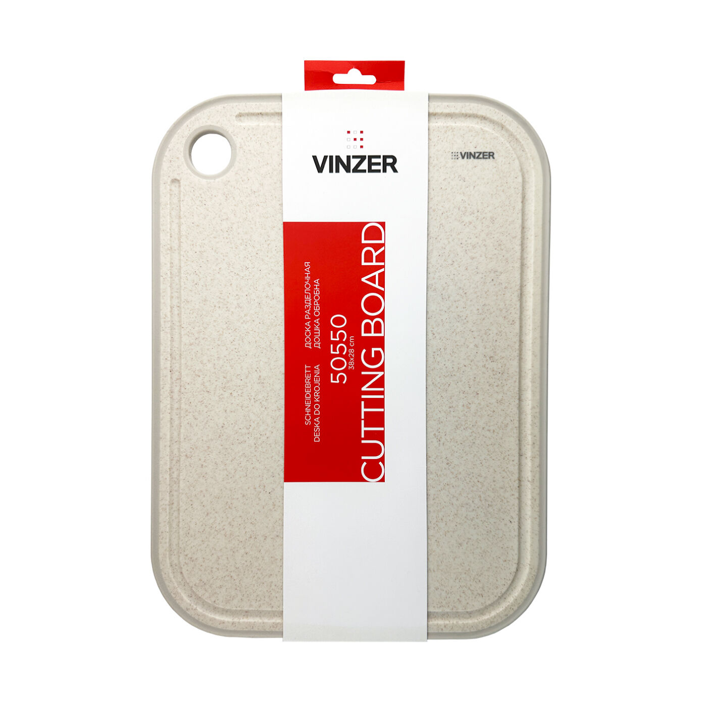Доска изготовлена из пшеничного волокна и высококачественного пищевого пластика. Материал легко моется, не впитывает влагу и запахи. Доска оснащена прорезиненной вставкой по краям для надёжной фиксации на столе и имеет канавку для стекания жидкости, а также имеет терку для натирания чеснока.