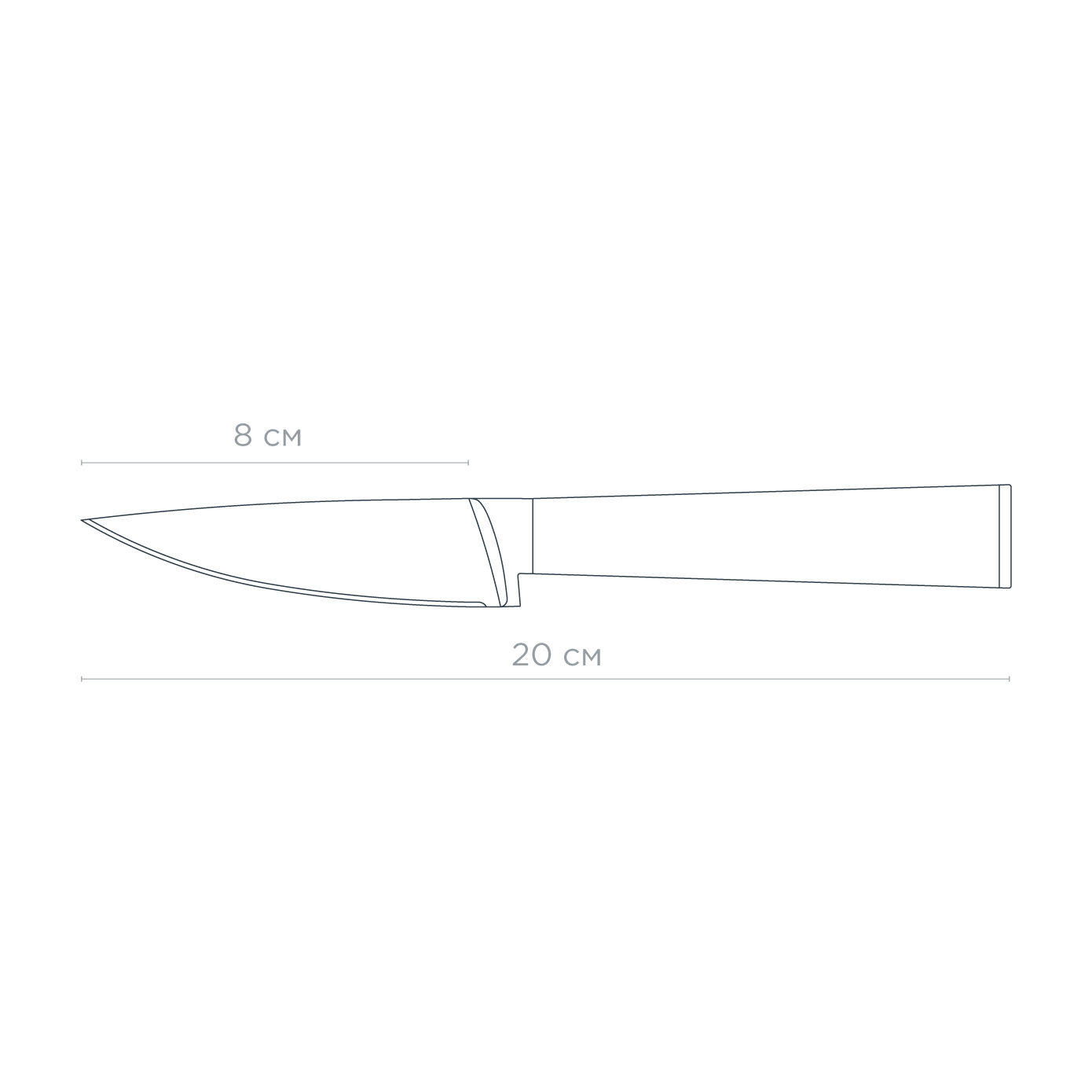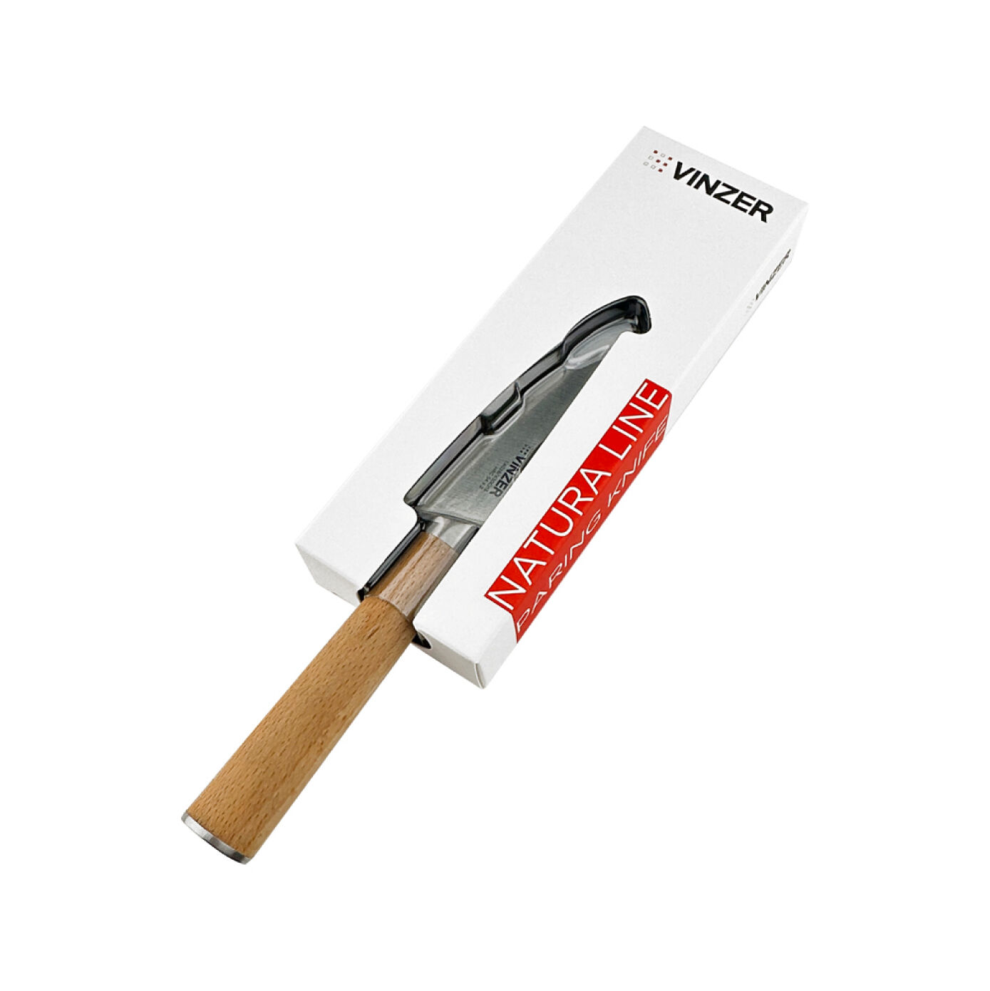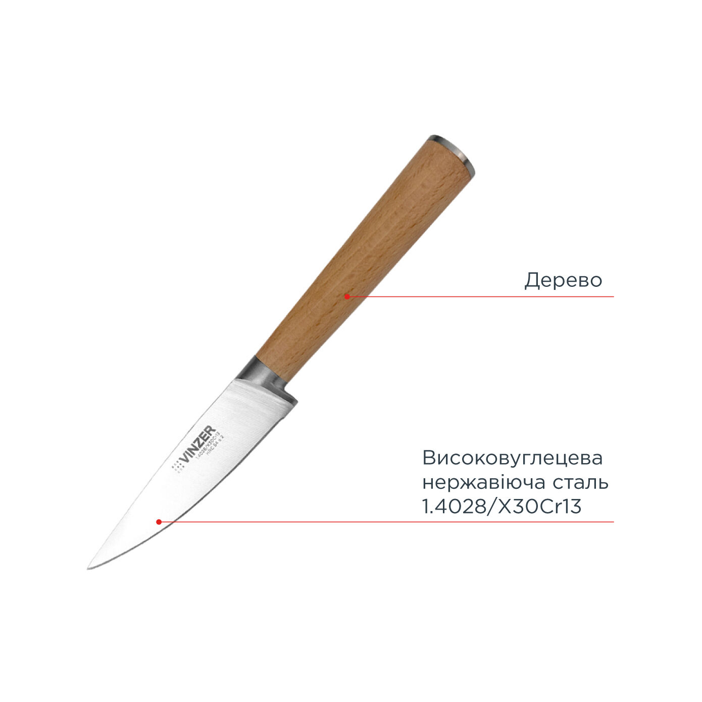 Нож изготовлен из высокоуглеродистой стали, устойчивой к механическим повреждениям и коррозии. Деревянная ручка удобна в использовании, имеет эргономический дизайн и не скользит во время работы. Лезвие имеет клинообразное сечение, поэтому режущая кромка долгое время сохраняет остроту и не требует частых заточек. Нож позволит тонко и аккуратно нарезать различные продукты.