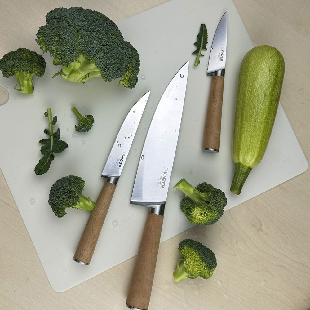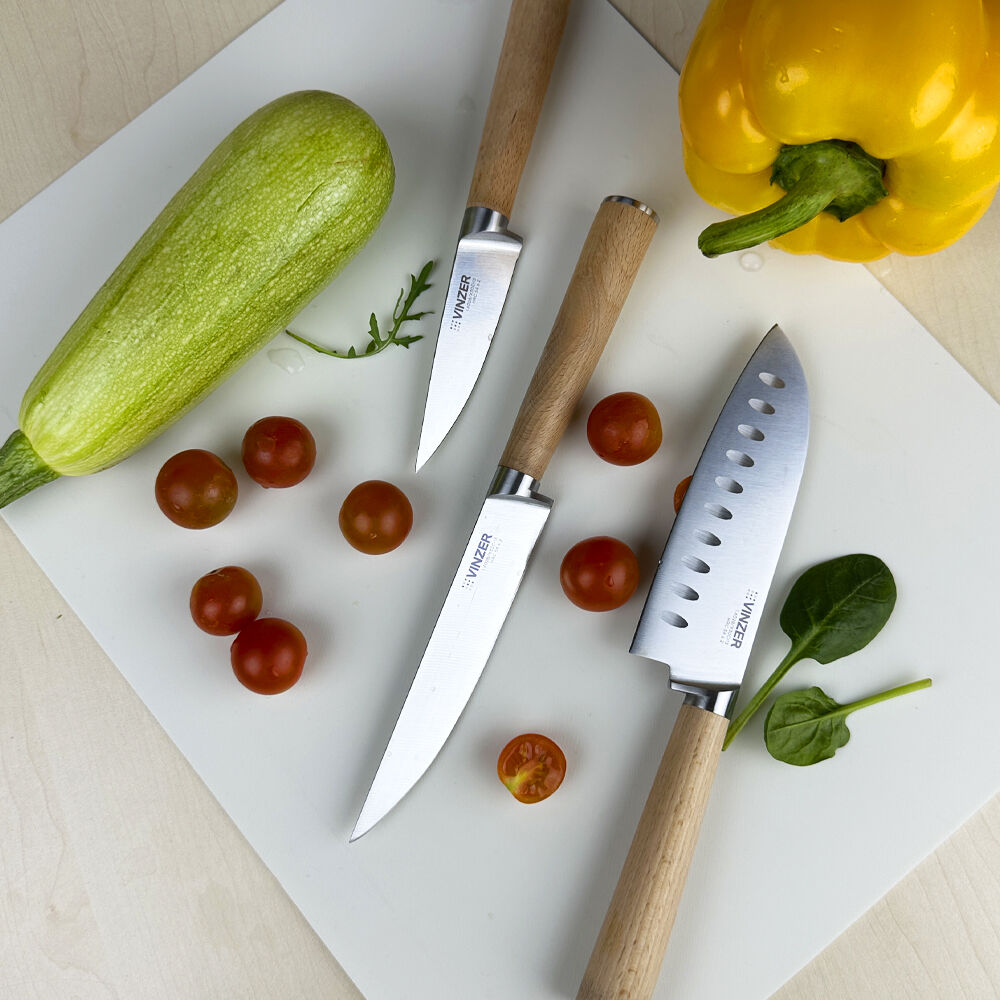 Нож — один из главных предметов на любой кухне. Нож тонко и аккуратно нарежет различные продукты благодаря острой заточке. Лезвие имеет клинообразное сечение, поэтому заводская заточка долгое время сохраняет остроту. Нож изготовлен из прочной высокоуглеродистой стали, которая устойчива к коррозии, деформации и повреждениям. Деревянная ручка удобно ложится в руку и не скользит во время работы.