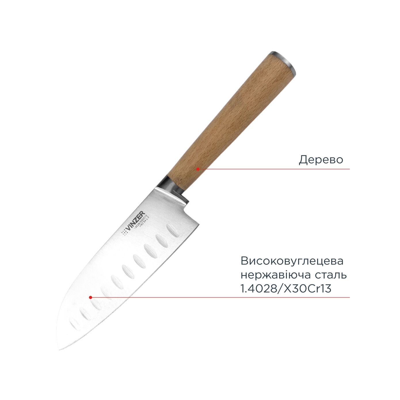Универсальный японский нож Сантоку легко и быстро справится с нарезкой любых продуктов. Лезвие изготовлено из высокоуглеродистой нержавеющей стали. Деревянная рукоятка удобно ложится в руку и способствует эффективной и безопасной работе. Клинок имеет клинообразное сечение, поэтому лезвие долгое время не требует заточки.