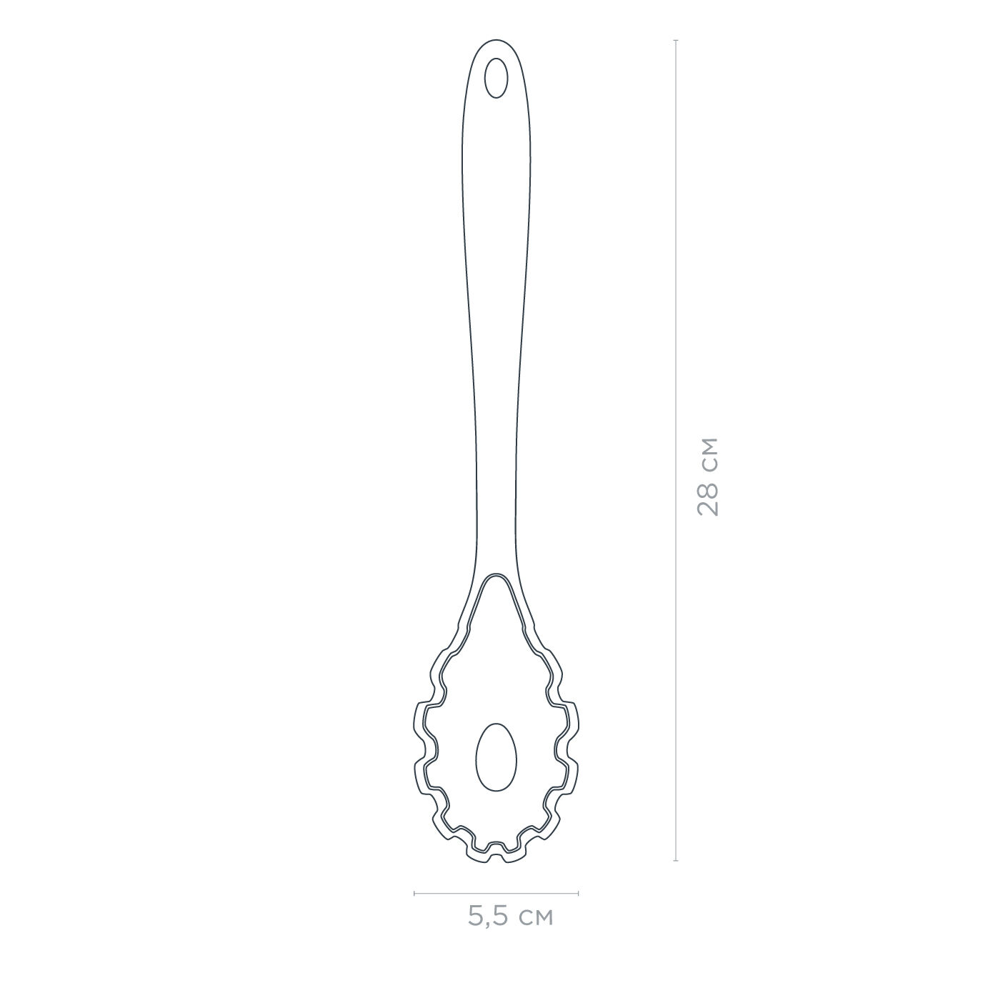 Ложка для спагетти — идеальный инструмент для удобной подачи и перемешивания длинной пасты. Зубчики по краям позволяют легко захватывать и удерживать макароны, а отверстие в центре помогает отмерять порцию и удалять лишнюю воду. Изготовлена из качественного силикона, не впитывает запахи и не выделяет вредных веществ при нагреве. Подходит для посуды с антипригарным покрытием. Легко моется вручную и в посудомоечной машине.