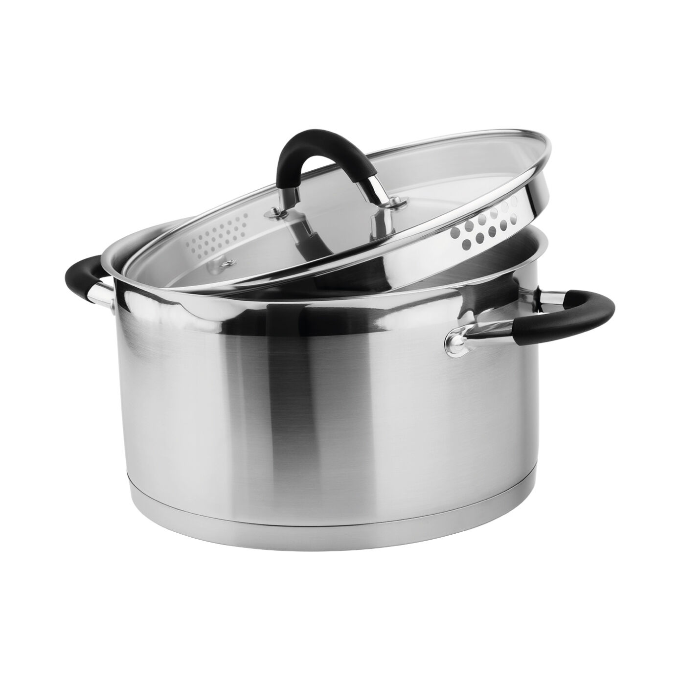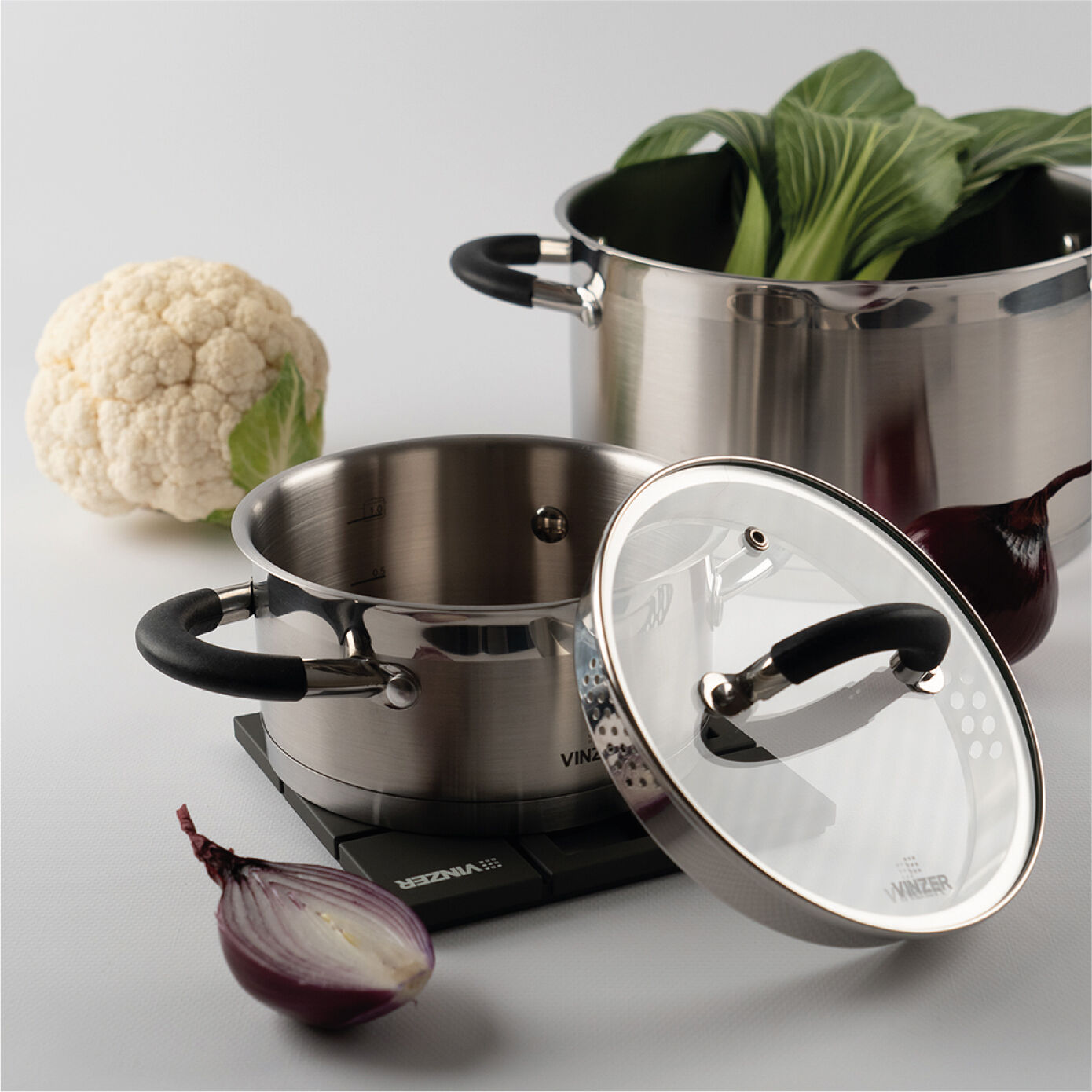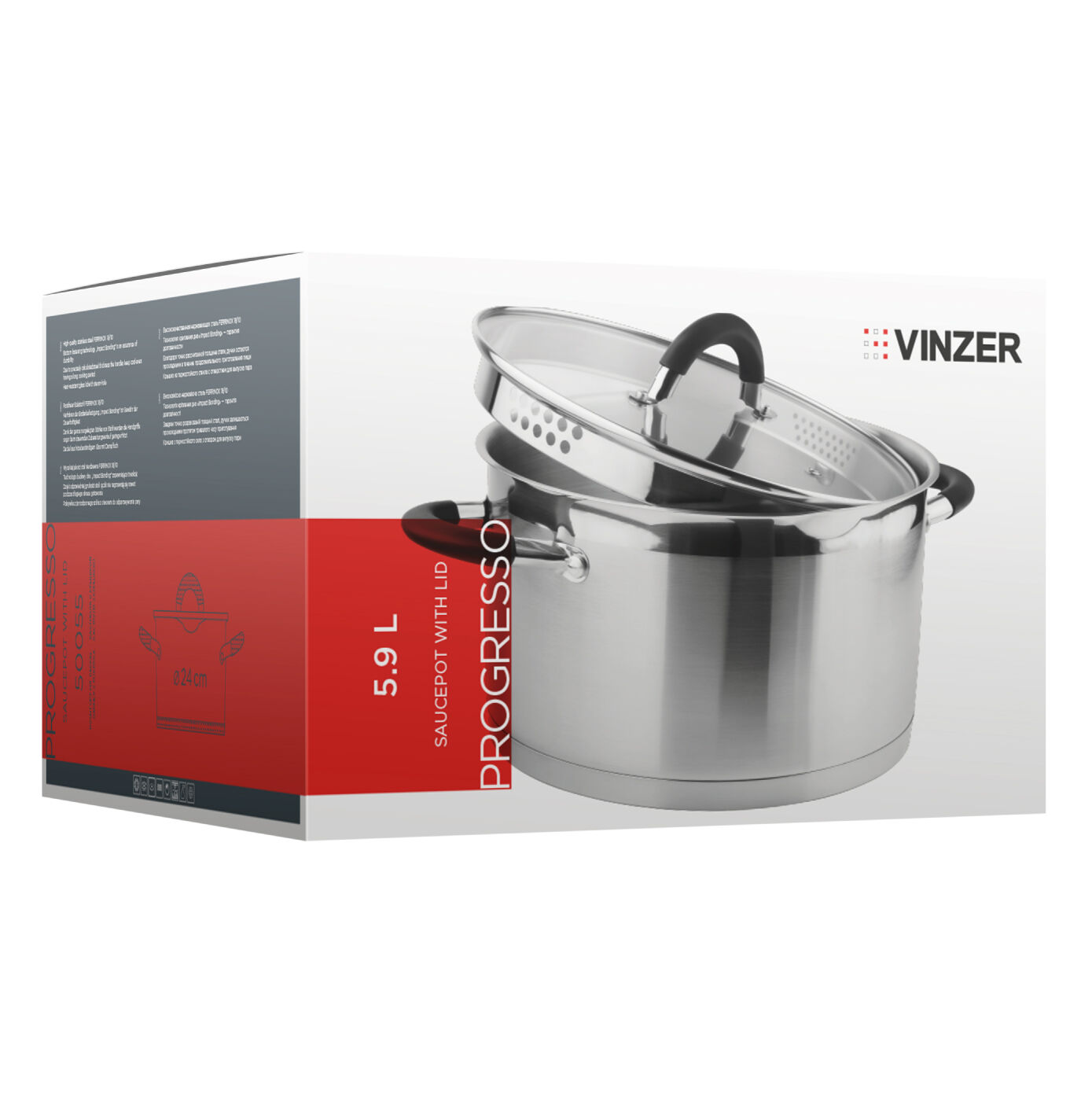 Вместительная кастрюля Vinzer Progresso диаметром 24 см и объемом 5.9 л с удобным носиком для бокового перелива изготовлена из высококачественной нержавеющей стали FERRINOX® 18/10. В ней можно готовить супы, борщ, сварить бульон, тушить овощи и мясо, попробовать приготовить по новым рецептам блюда от известных шеф-поваров. В ней можно делать практически все, чтобы ваша большая семья чувствовала вашу заботу о них. Ведь вся посуда Vinzer разработана для приготовления разных блюд с максимальной сохранностью витаминов и полезных веществ.Кастрюля имеет уникальное трехслойное дно, изготовленное по технологии "Impact Bonding": два слоя нержавеющей стали и слой алюминиевого сплава между ними, что способствует аккумуляции и равномерному распределению тепла. Эргономичные ненагревающиеся ручки из нержавеющей стали с силиконовыми вставками прикреплены к корпусу надежным заклепочным соединением.Стильное сочетание зеркальной и матовой полировки гармонично впишется в любой кухонный интерьер. Кастрюля Vinzer Progresso подходит для использования на всех видах плит, включая индукционные варочные поверхности.